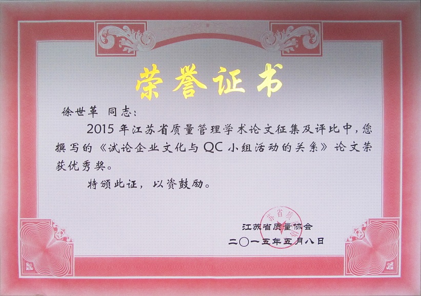 由江蘇省質量協(xié)會舉辦的2014年江蘇質量管理學術論文征集評選活動落下帷幕,5月8日在南京華江賓館召開了江蘇質量管理學術論文表彰暨交流會,江蘇省質量技術監(jiān)督局副局長張前、質量處處長兼省質量協(xié)會副秘書長祁寧清、省質量協(xié)會會長耿寧等及獲獎作者參加了會議。集團公司徐世革同志的《試論企業(yè)文化與QC小組活動的關系》榮獲優(yōu)秀獎。