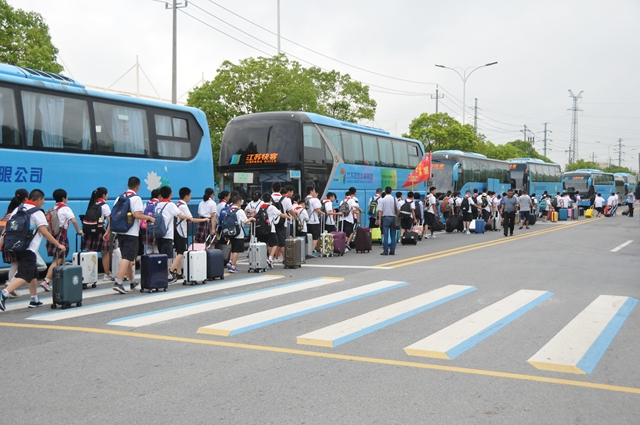 江蘇揚汽集團承擔了此次新生運輸任務,由旅游出租分公司牽頭,抽調(diào)快客、快鹿等各有車單位的大客車38輛,運送樹人中學師生近2000人。