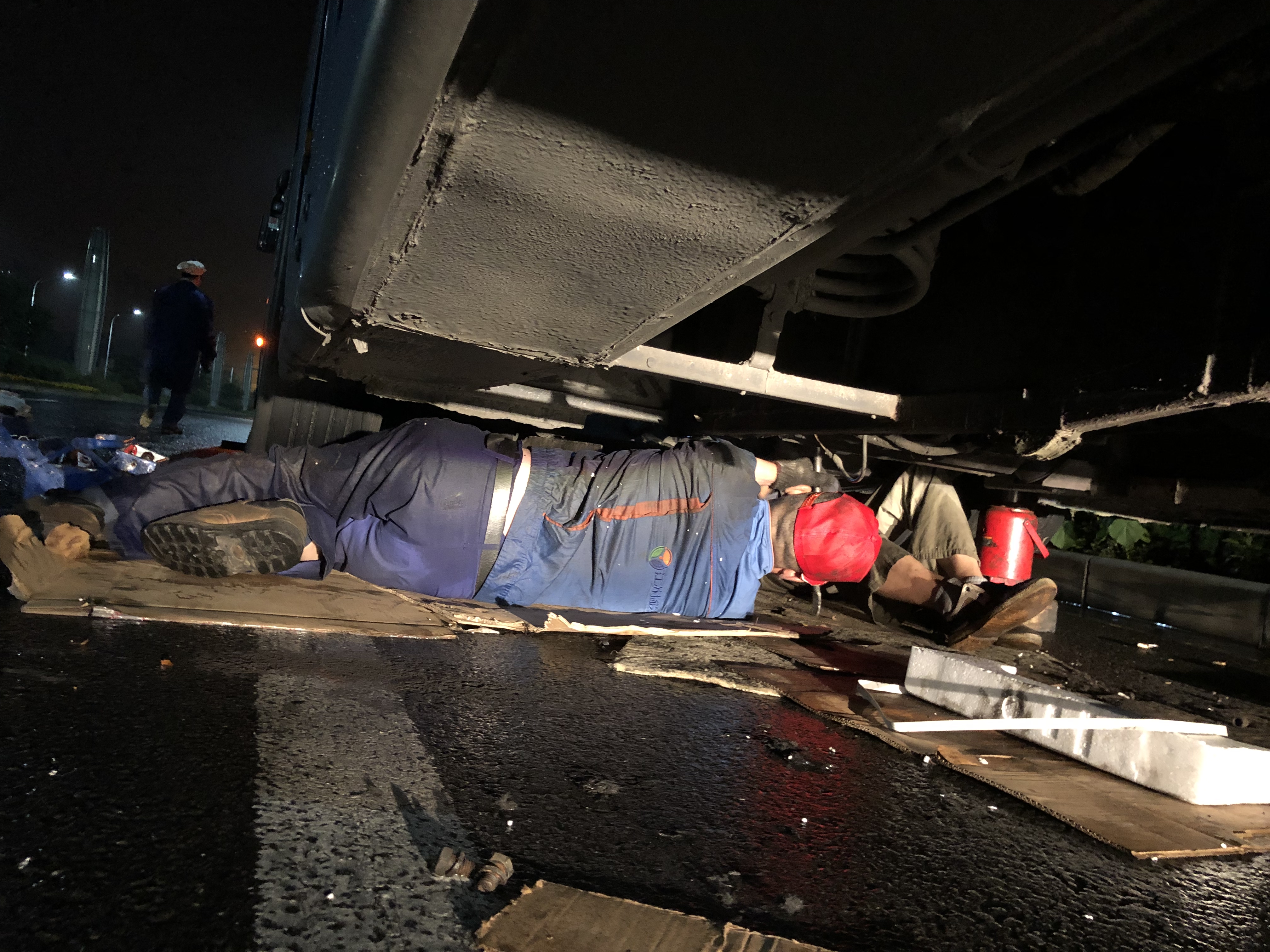 為了快速查出車輛故障,來到現(xiàn)場后師傅們也顧不得許多,只是簡單地做了避雨防護,就開始查找每一處可疑的故障,原來是離合器片磨損無法啟動,需要進行更換。此時客服中心又聯(lián)系了在家休息的青工花兆貴,他冒雨回廠領(lǐng)取離合器三件套,再趕赴故障現(xiàn)場進行安裝。由于是露天作業(yè),加之夜晚陰雨天氣,視線模糊,給維修工作帶來很大難度,但是維修師傅們團結(jié)協(xié)作,經(jīng)過數(shù)小時的緊張搶修,故障解除,而此時搶修師傅們的衣服已經(jīng)完全濕透。