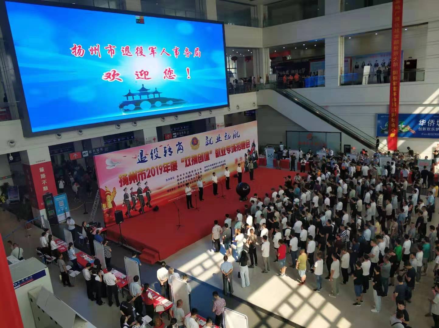 8月17日上午,揚(yáng)州市2019年度“雙擁創(chuàng)建”就業(yè)專場招聘會(huì)在揚(yáng)州西部客運(yùn)樞紐揚(yáng)州汽車站一樓大廳舉辦。會(huì)場設(shè)置50多個(gè)招聘席位,計(jì)劃安排1500個(gè)就業(yè)崗位,1200余名退役軍人及隨軍家屬參加現(xiàn)場招聘。招聘活動(dòng)由揚(yáng)州市雙擁領(lǐng)導(dǎo)小組、揚(yáng)州市退役軍人事務(wù)局、揚(yáng)州軍分區(qū)、揚(yáng)州市人社局聯(lián)合主辦,旨在拓寬退役軍人就業(yè)渠道,為退役軍人和企業(yè)之間搭建起互通橋梁。