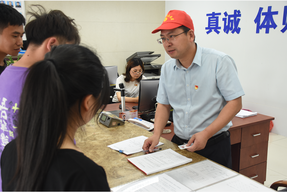 在報名大廳的服務現(xiàn)場,龔宇峰為前來學駕的學員登記報名信息,辦理手續(xù),并與他們交談,耐心解答他們的問題、囑咐在學習駕駛過程中需要注意的事項。