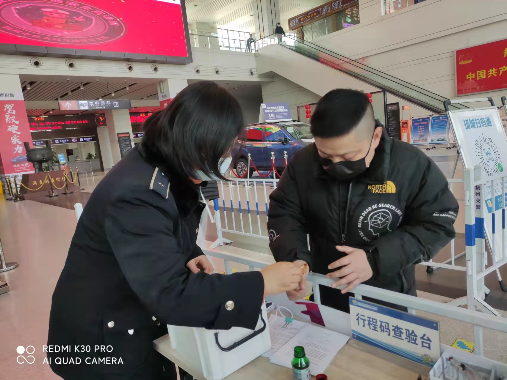下午一點半,揚州汽車站售票大廳門口,正在認真查驗行程碼的劉揚,看著對面遞身份證過來的一雙手,手上傷痕累累,手里握著一團紙巾,紙巾上血跡斑斑,于是關(guān)切地詢問起來。經(jīng)詢問得知,原來旅客于先生是常州人,在揚州出差三天了,估摸著今天的工作能夠忙完,想早點趕回常州,工作一結(jié)束,便從工作地點騎公共電動車來揚州汽車站乘車,誰知一個不小心,摔了一跤,羽絨服破了,手機摔壞了,兩只手也蹭破了好幾處,血不停地淌。
