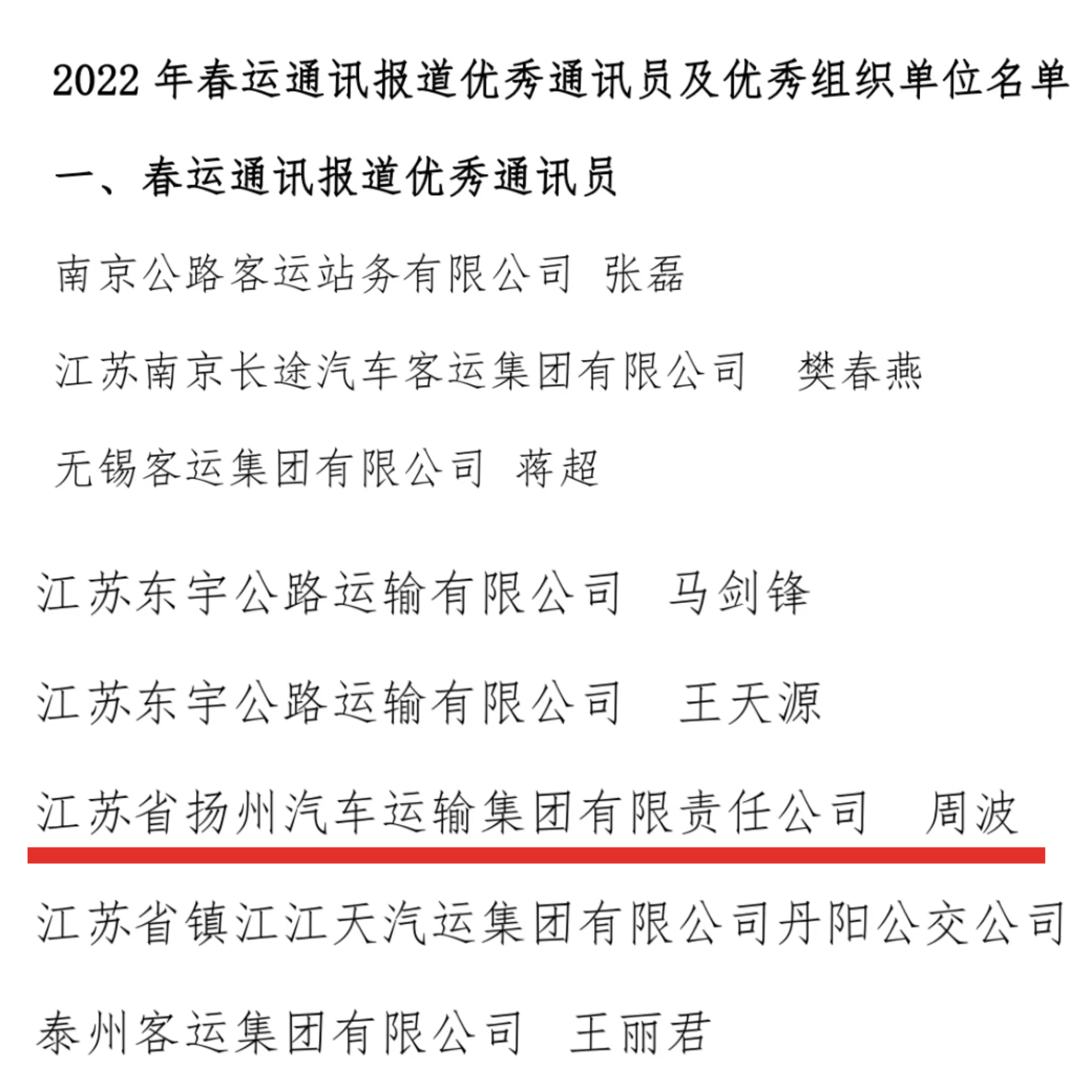 近日,江蘇省交通物流協(xié)會(huì)汽車運(yùn)輸分會(huì)下發(fā)《關(guān)于表彰 2022、2023 年春運(yùn)報(bào)道“優(yōu)秀通訊員”、“優(yōu)秀組織獎(jiǎng)”的決定》,集團(tuán)周波獲評(píng)“2022 年、2023年春運(yùn)通訊報(bào)道優(yōu)秀通訊員”,陳思宇獲評(píng)“2023 年春運(yùn)通訊報(bào)道優(yōu)秀通訊員”。