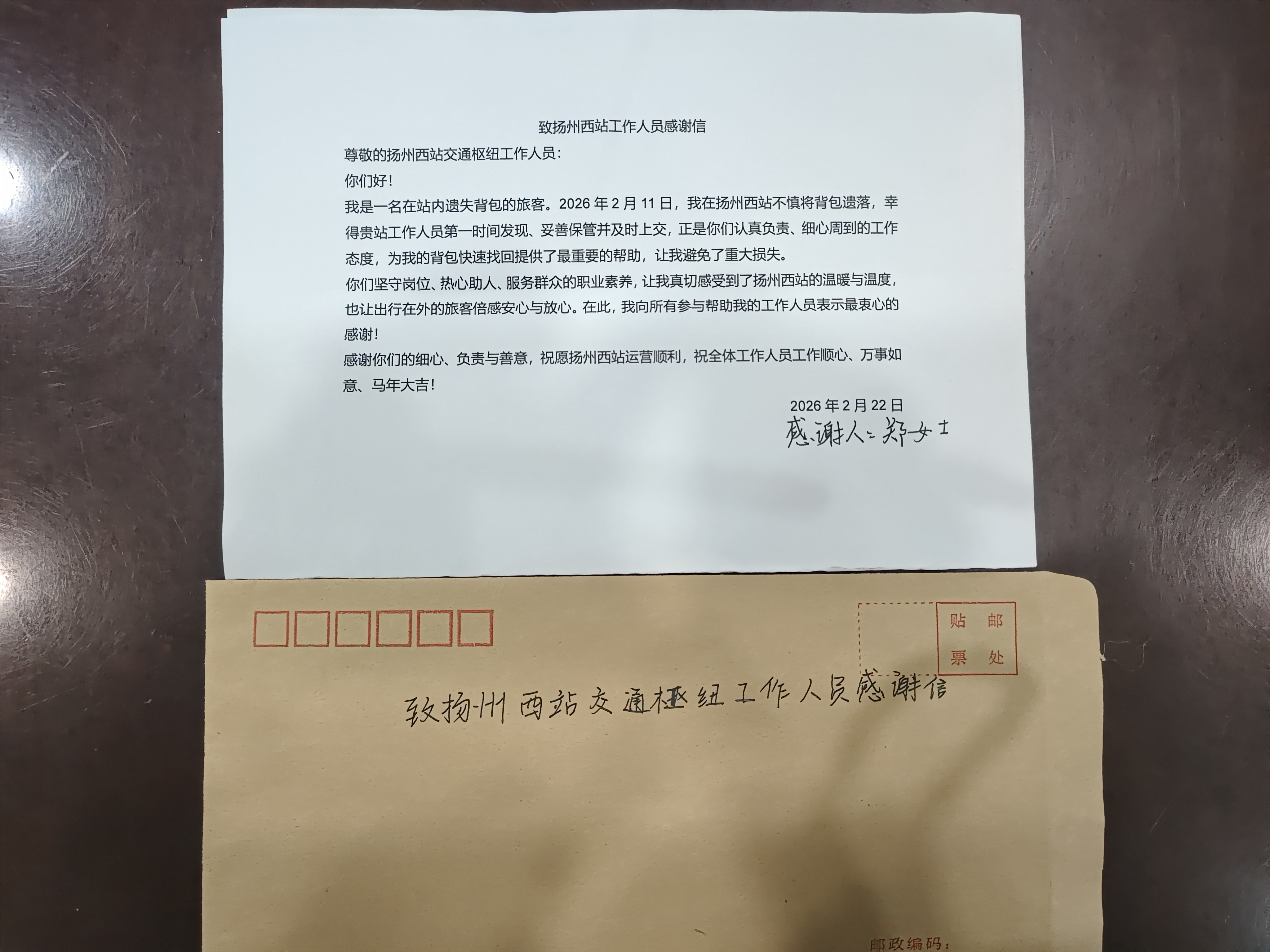 而這份“遲來”的感謝信,正是失主對揚州站工作人員認真負責(zé)態(tài)度的由衷肯定。信中寫道:“從發(fā)現(xiàn)失物到妥善保管、再到主動對接,每一個環(huán)節(jié)都體現(xiàn)出你們嚴謹細致、熱心助人的職業(yè)素養(yǎng)。正是因為有你們這樣堅守崗位、默默付出的工作人員,才讓揚州這座‘好地方’更溫暖、更安心。”