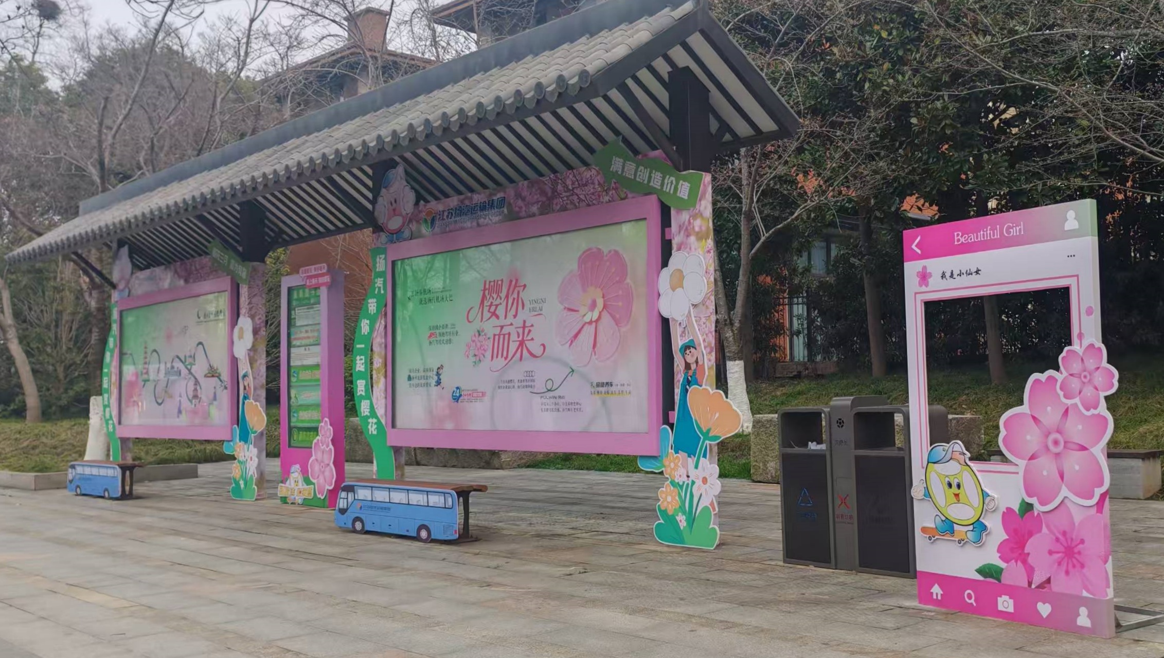 本次活動緊扣“櫻運(yùn)而生·2026鑒真櫻花季”主題,圍繞“賞櫻專線+站臺煥新+品牌聯(lián)動”三條主線展開。鑒真路櫻花大道是賞櫻核心區(qū),揚(yáng)汽集團(tuán)在此進(jìn)行了全面視覺改造:以粉白櫻花為主色調(diào),融入揚(yáng)州文化元素,配以“煙花三月,櫻為有你”“揚(yáng)汽帶你一起賞櫻花”等暖心標(biāo)語,使宣傳點(diǎn)兼具實(shí)用與觀賞功能,成為市民游客爭相拍照的“打卡點(diǎn)”。